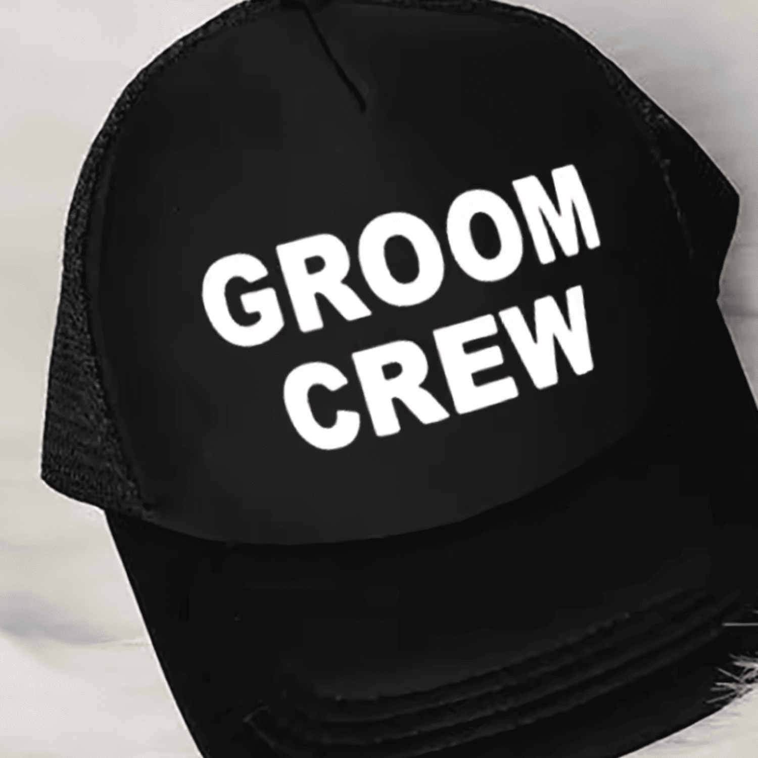 Wyrazisty biały napis „Groom Crew”.