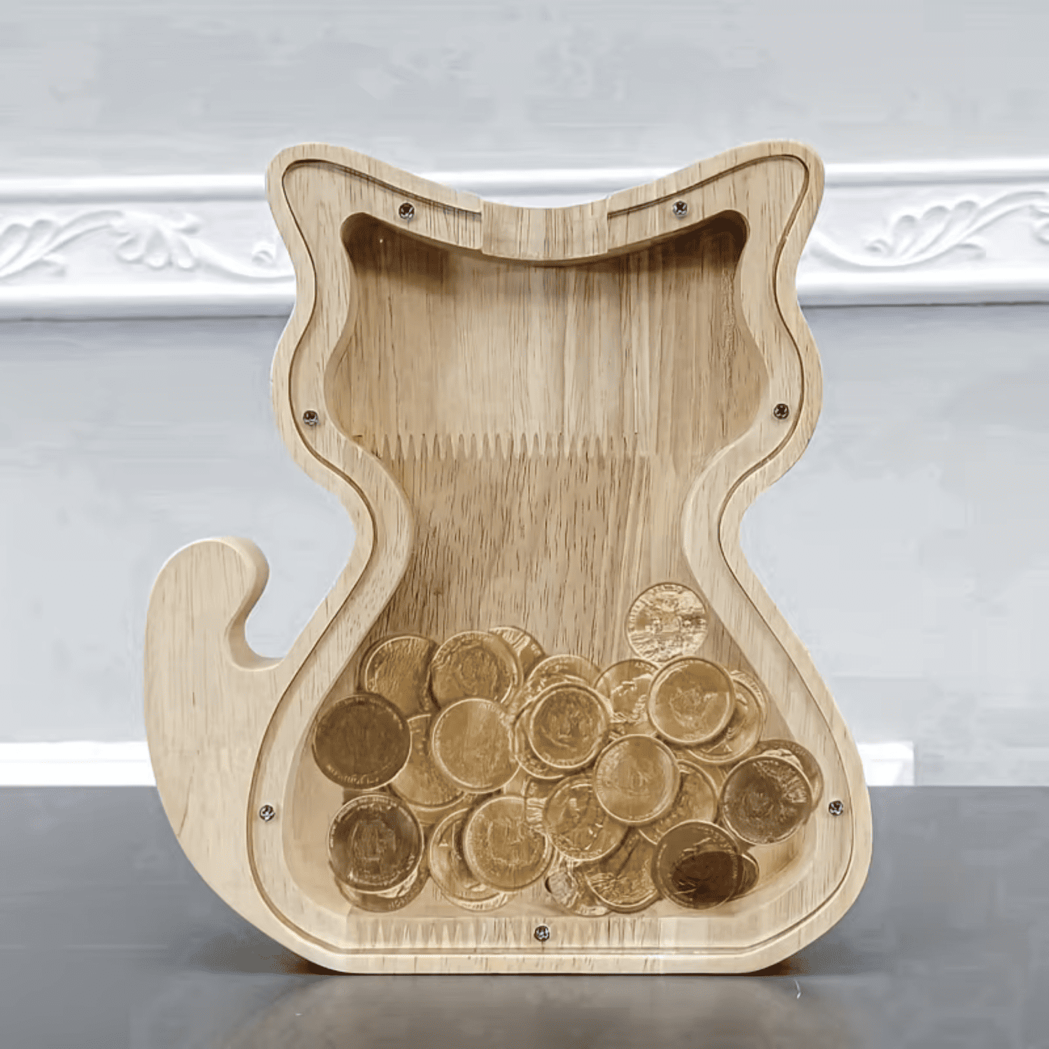 Ta elegancka skarbonka w kształcie kota to połączenie ekologicznego designu z praktyczną funkcją. Wykonana z litego drewna i wyposażona w przezroczysty panel akrylowy, pozwala obserwować rosnące oszczędności. Idealna do pokoju dziecka, salonu lub biura – wprowadza przytulny, naturalny akcent.