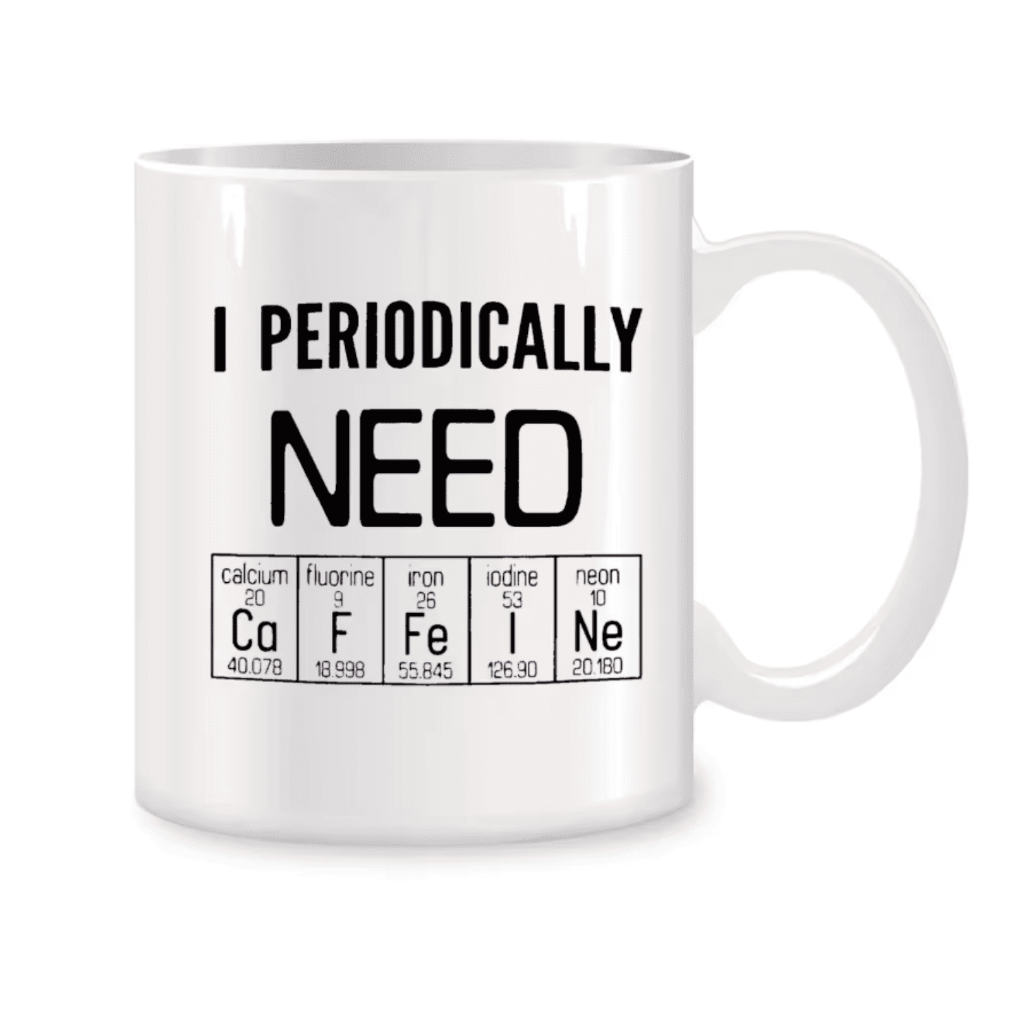Dla miłośników kawy i nauki – kubek „I Periodically Need” to humorystyczne połączenie chemii i codziennej dawki kofeiny. Nadruk złożony z symboli pierwiastków tworzy słowo „Caffeine”, co sprawia, że to idealny prezent dla nauczyciela, studenta lub fana eksperymentów przy kawie.