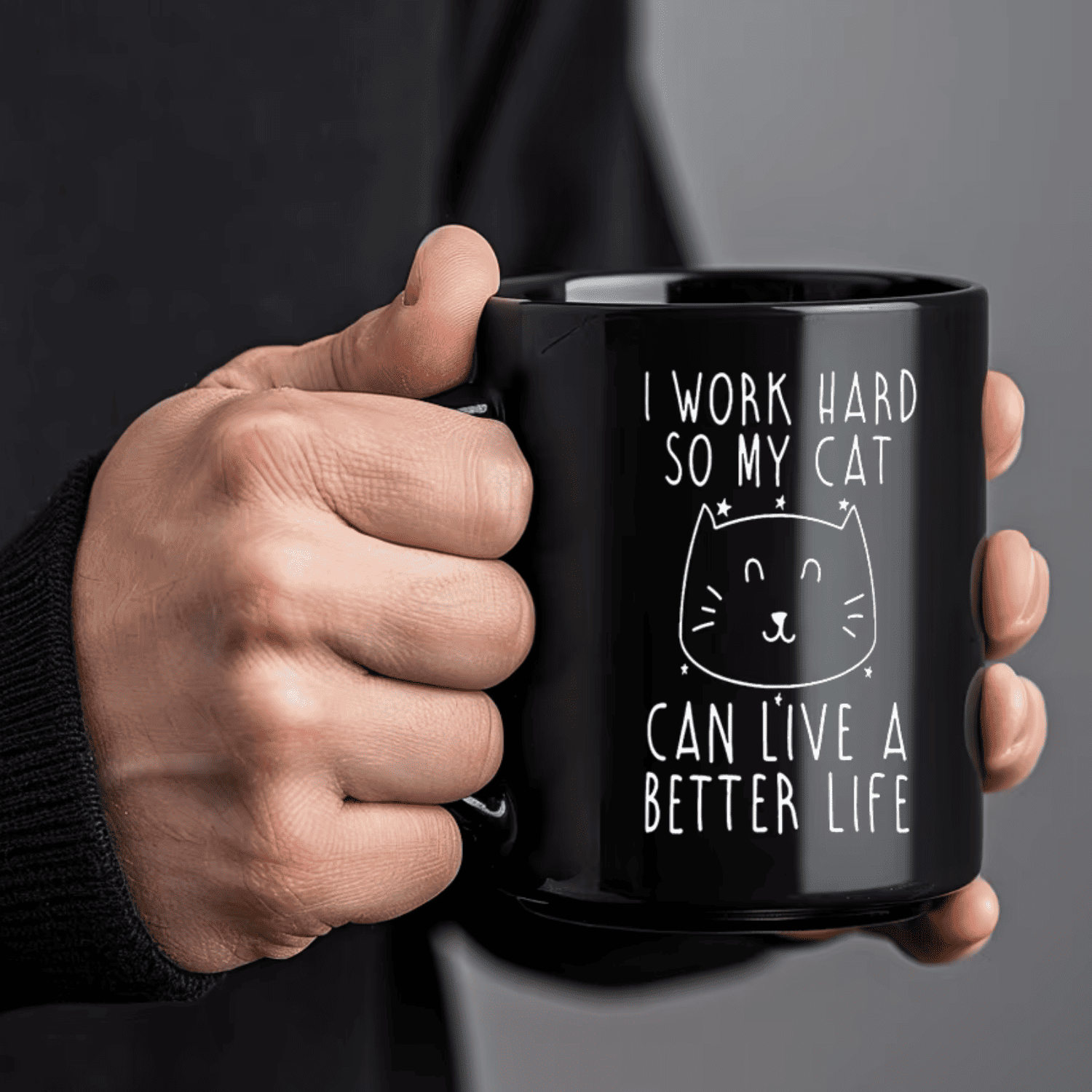 Jeśli każdy Twój dzień zaczyna się od karmienia, głaskania i rozpieszczania kota – ten kubek jest właśnie dla Ciebie. Humorystyczny napis „I work hard so my cat can live a better life” oddaje codzienną prawdę każdego kociarza: pracujesz ciężko, by Twój pupil miał wszystko, czego zapragnie.