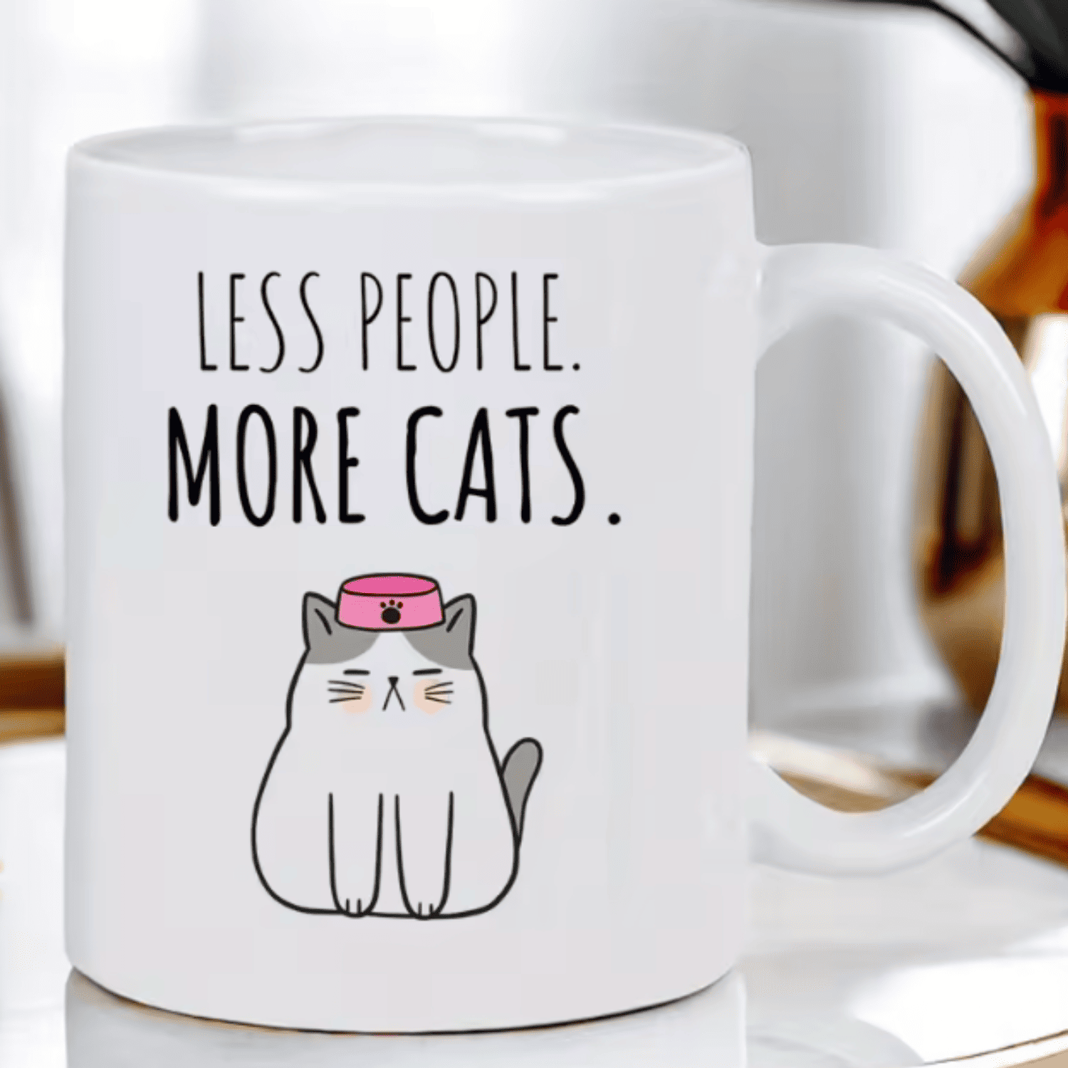Kubek „Less People, More Cats” to zabawny i szczery sposób, by wyrazić swoje uczucia wobec futrzastych przyjaciół. Nadruk z uroczym kotem w różowym kapeluszu przyciąga wzrok i sprawia, że każdy łyk kawy czy herbaty smakuje lepiej.