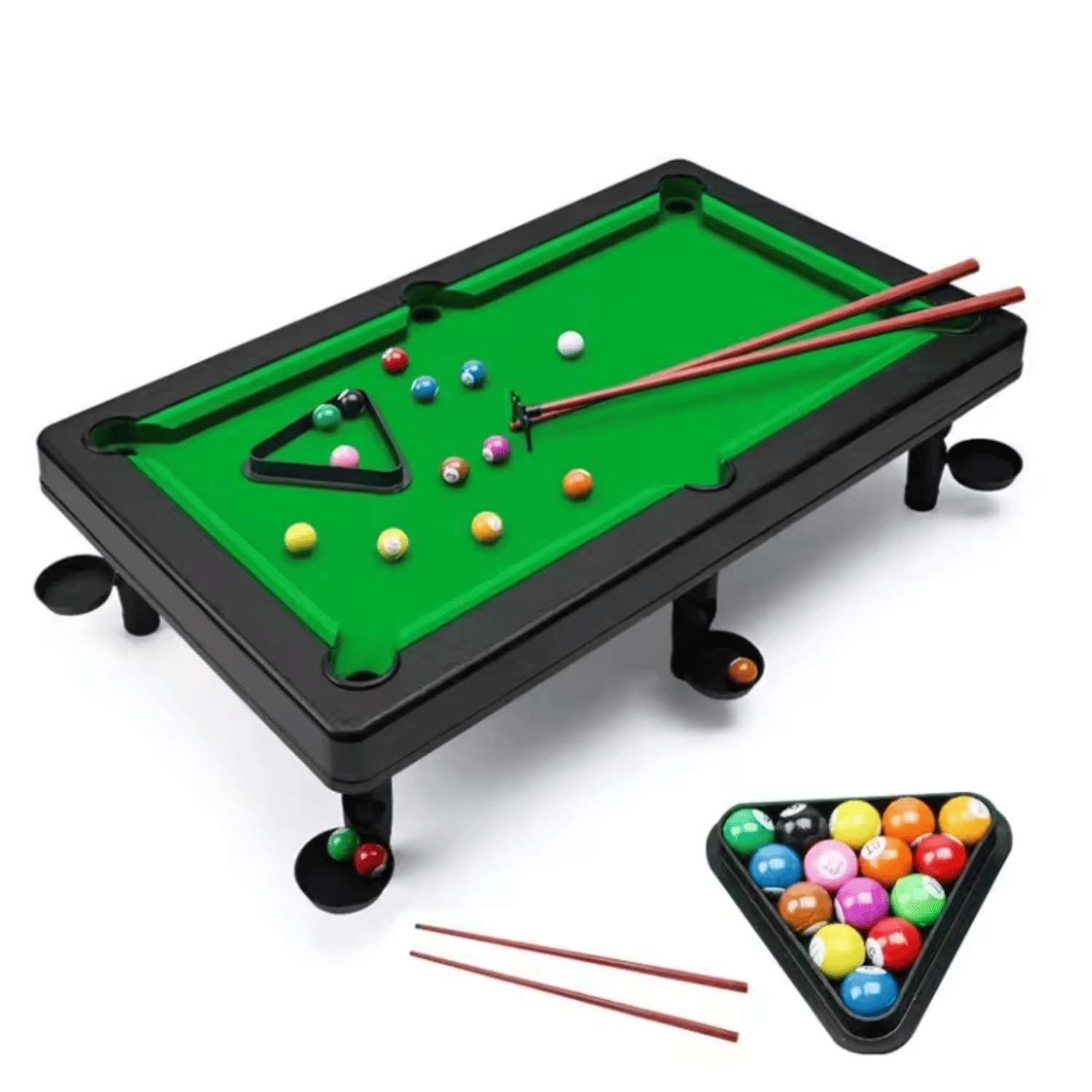 Zestaw zawiera wszystko, czego potrzebujesz: mini stół bilardowy, zestaw kolorowych bil, dwa kije i trójkąt do ustawiania bil.
