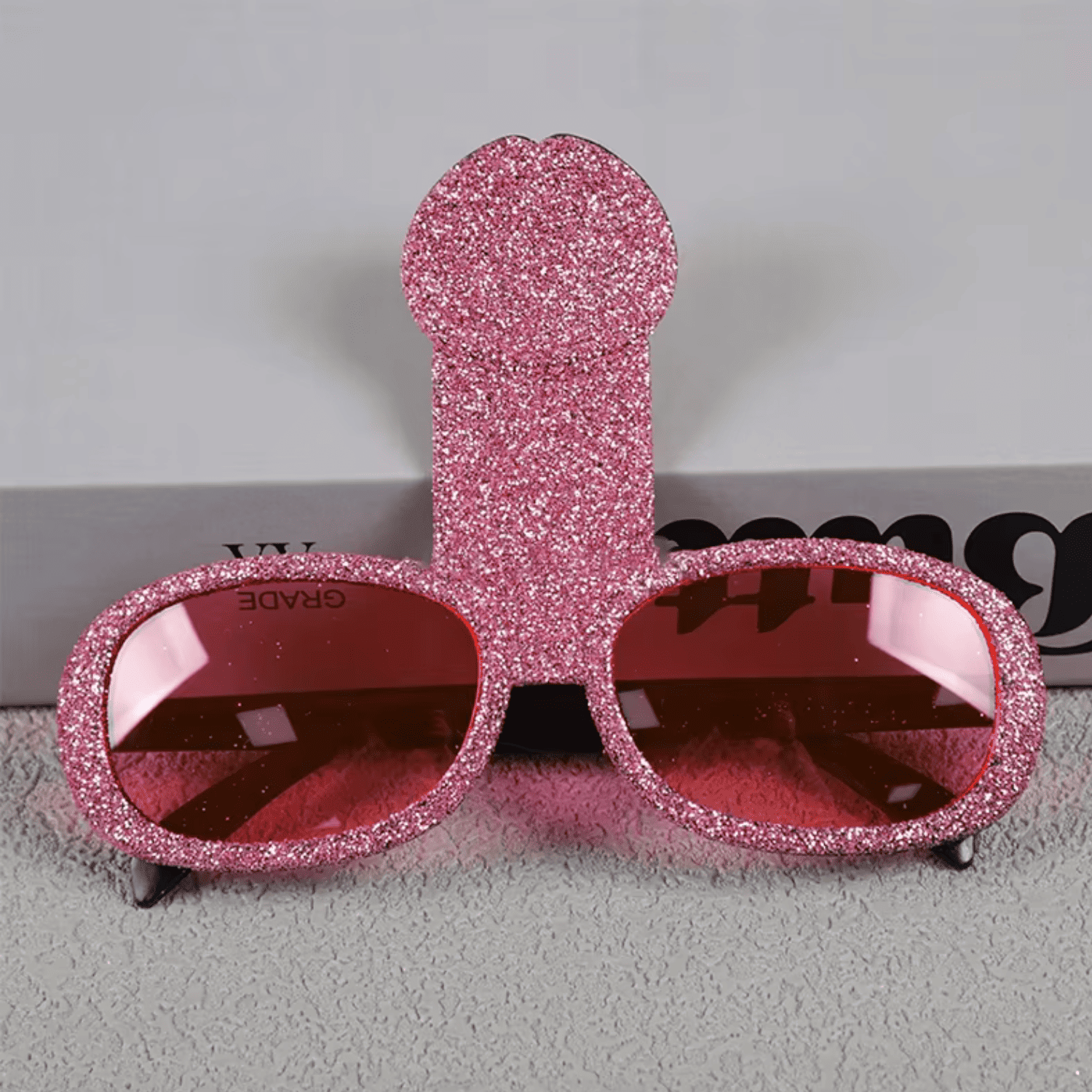 Okulary wykonano z lekkiego, trwałego plastiku z brokatowym wykończeniem. Mają różowe szkła i charakterystyczny kształt, który natychmiast przyciąga spojrzenia. To idealny gadżet na zdjęcia, zabawy i wejście do klubu w imprezowym stylu!
