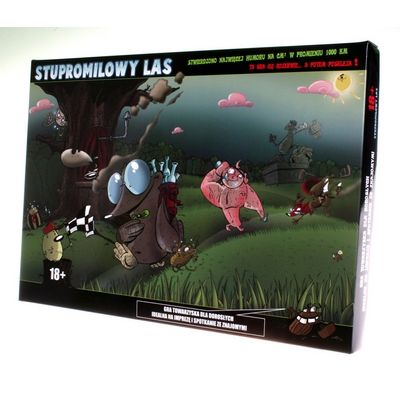• W skład zestawu wchodzi: plansza do gry, 40 kart z zadaniami, 12 kart postaci, 12 pionków z postaciami, 5 podstawek pod pionki, kostka, zasady gry, historia Stupromilowego Lasu.