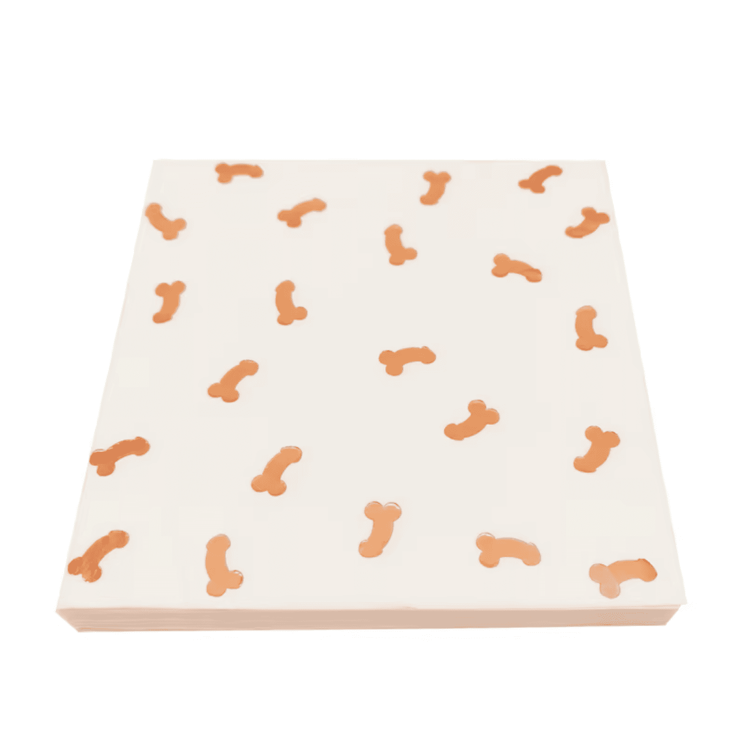 Serwetki wykonano z mocnego, chłonnego papieru, dzięki czemu dobrze sprawdzają się zarówno do przekąsek, jak i drinków. Wzór penisów w kolorze rose gold wygląda elegancko, a jednocześnie rozbraja swoją zabawnością. Idealne do zdjęć i wideo z hashtagiem #bridetribe.