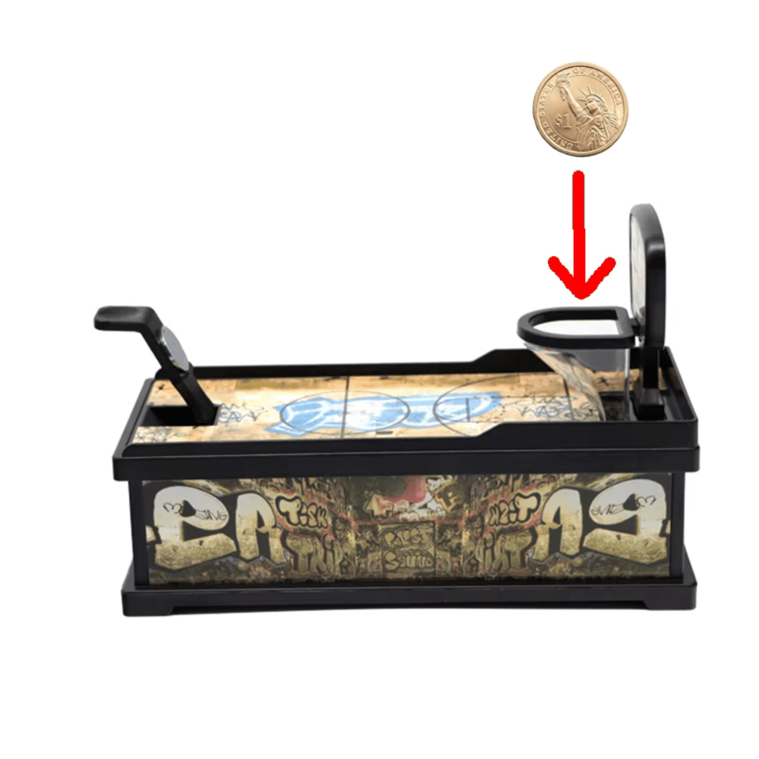 Ta nietypowa skarbonka łączy świat sportu z zabawą. Przypomina miniaturowe boisko do koszykówki – z dźwignią, koszem i przestrzenią na monety. Wystarczy umieścić monetę na katapulcie, nacisnąć i próbować trafić do kosza. Każdy celny rzut to satysfakcja i kilka groszy do skarbonki .