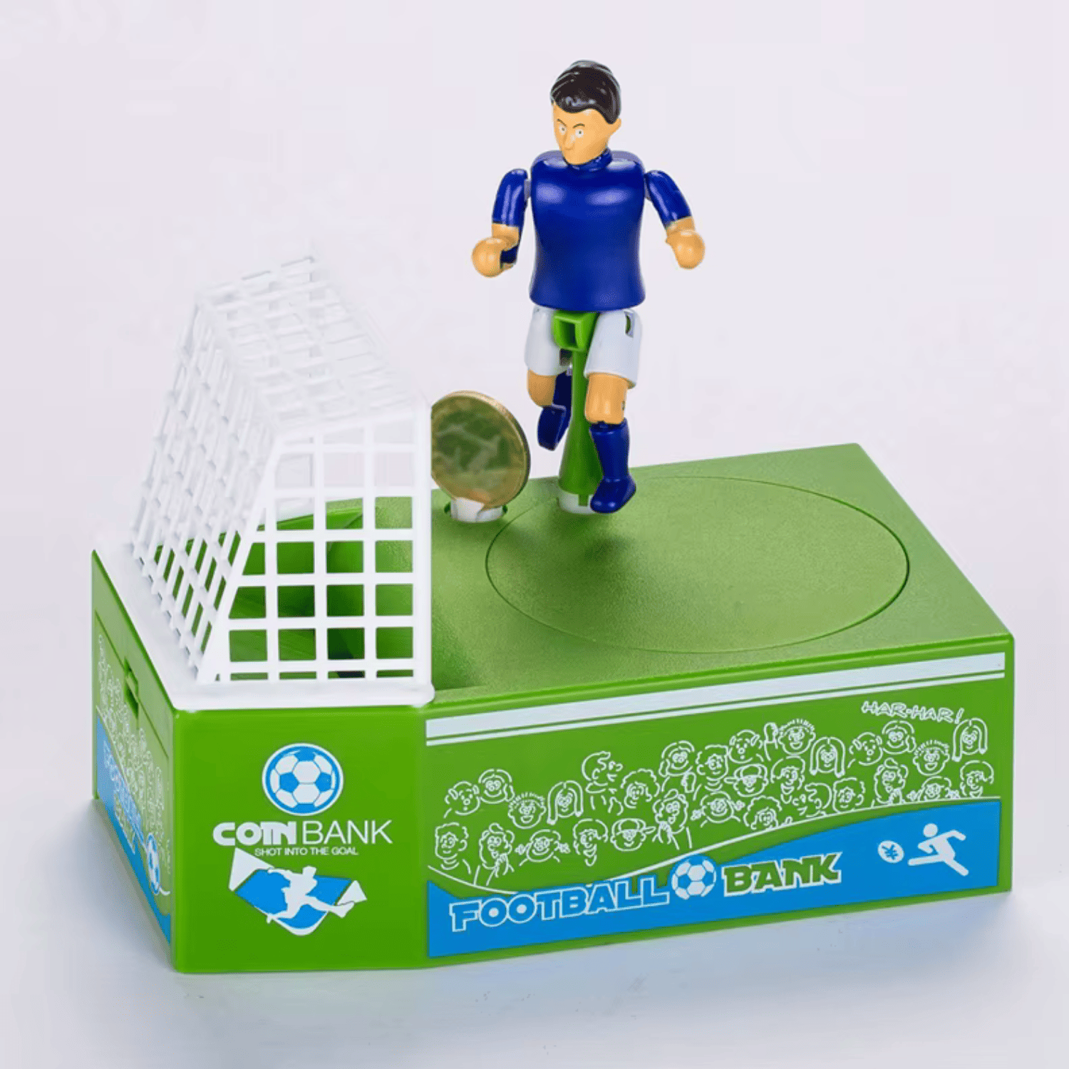 Ta interaktywna skarbonka Football Bank sprawi, że każde wrzucenie monety będzie jak strzelenie gola! Po umieszczeniu monety na murawie, piłkarz automatycznie wykonuje kopnięcie i trafia do bramki – a moneta wpada do środka urządzenia .
