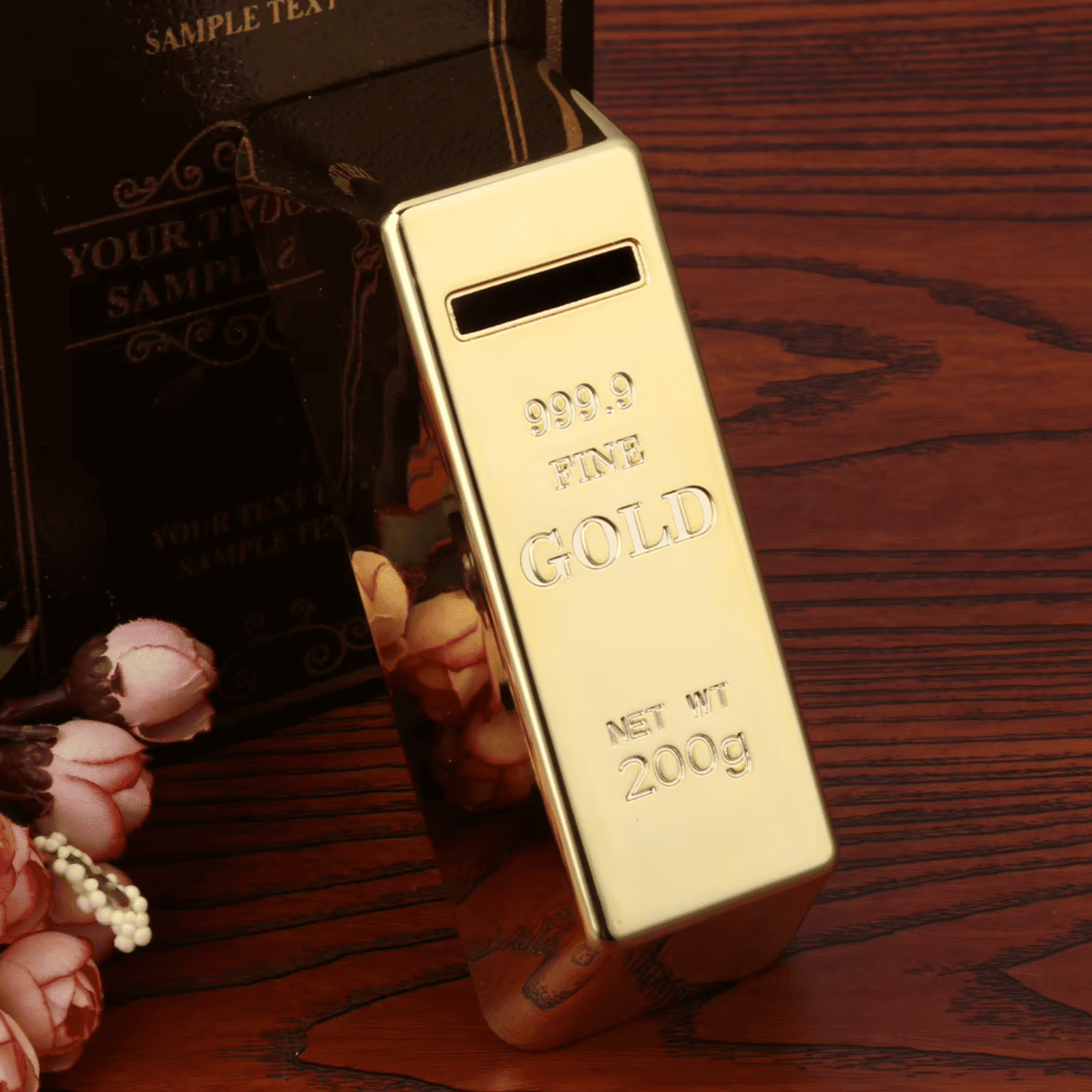 Złota sztabka skarbonka to wyjątkowy gadżet, który łączy humor z elegancją. Jej połyskująca powierzchnia imituje prawdziwy metal szlachetny, a kształt przypomina autentyczną sztabkę złota z wybitym napisem „FINE GOLD 999.9” i wagą 200 g .