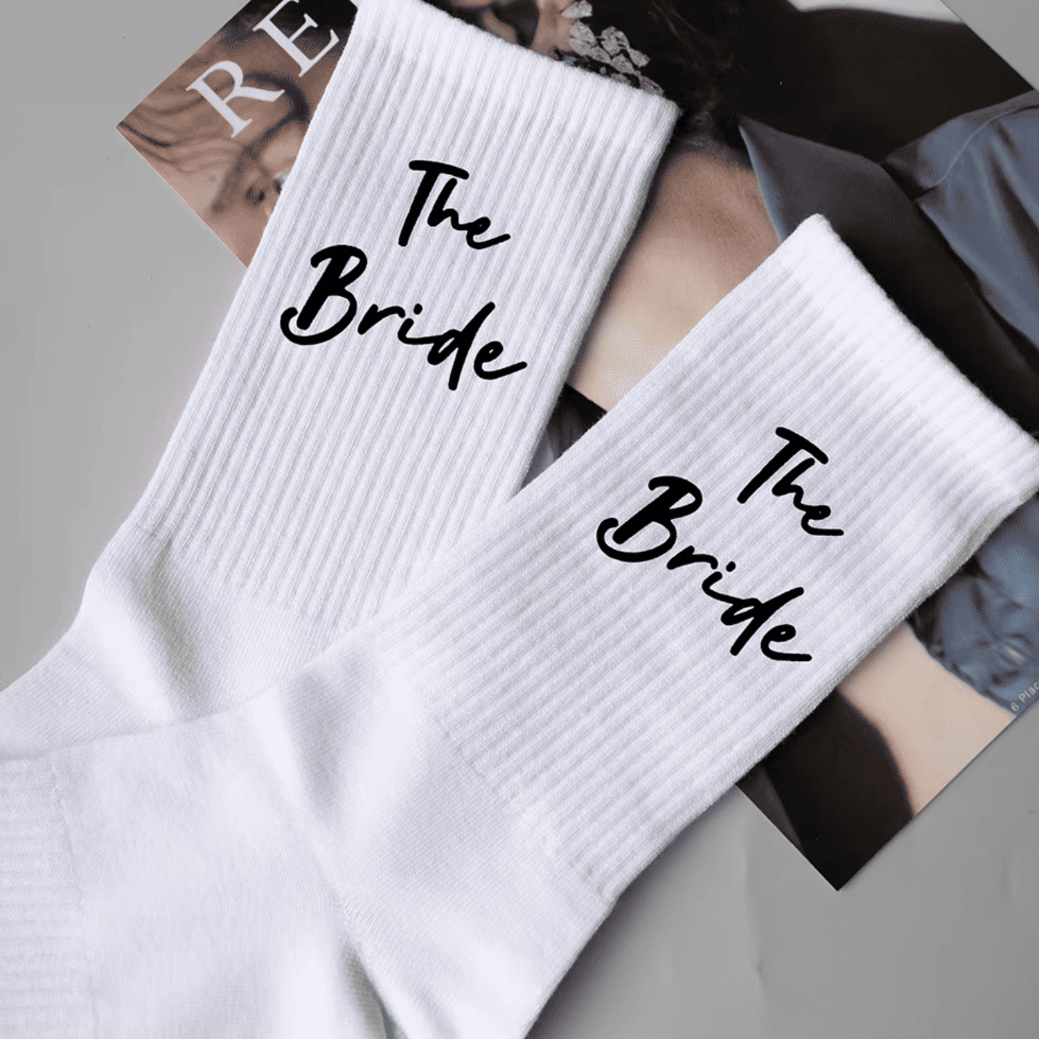 Skarpetki wykonane są z elastycznej, przewiewnej tkaniny, dzięki czemu idealnie dopasowują się do stopy. Napis „The Bride” w eleganckiej czerni dodaje uroku i stanowi świetne tło do zdjęć z przygotowań. Idealne jako prezent lub element zestawu Bride Party.