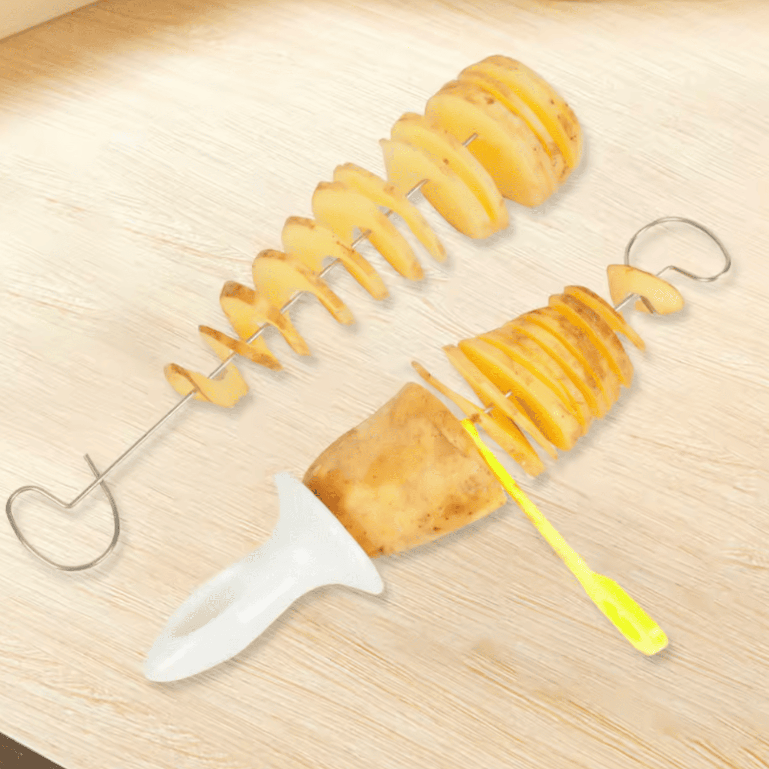 Spiralna krajarka typu tornado to ręczne narzędzie, które tnie ziemniaki w cienkie, równe spirale. Wystarczy nabić ziemniaka na stalowy pręt i przekręcić uchwyt – ostrze ze stali nierdzewnej wykroi efektowny kształt, idealny do smażenia lub pieczenia. Produkt jest lekki, kompaktowy i wygodny w użyciu, dzięki czemu przygotowanie frytek staje się świetną zabawą.