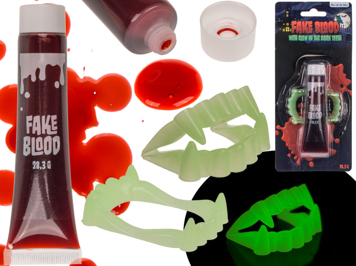Ten zestaw to idealne połączenie – krew, która wygląda jak prawdziwa, i zęby, które świecą w ciemności. Czyli: krwawa elegancja spotyka nowoczesną technologię straszenia!