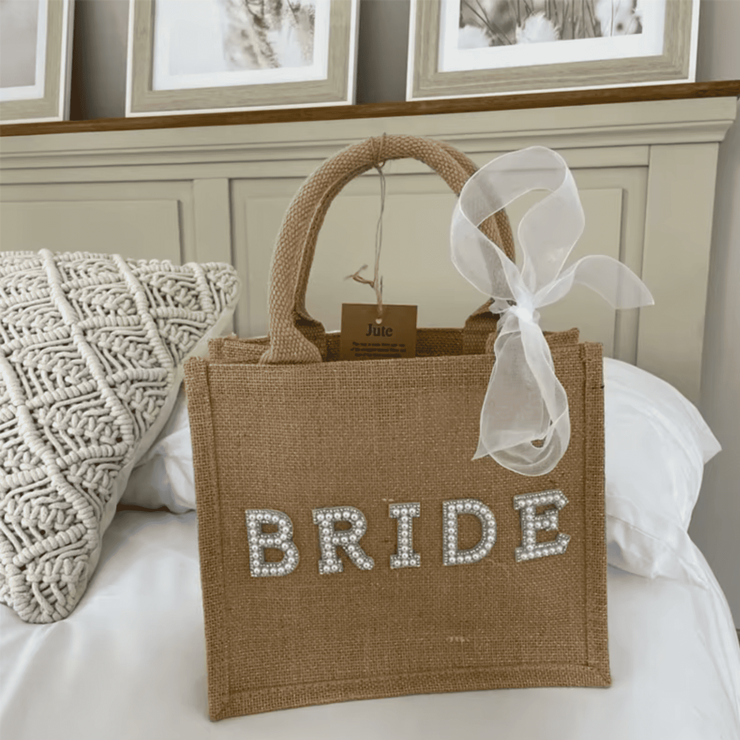 Jutowa torba z napisem „BRIDE” ozdobionym perłami